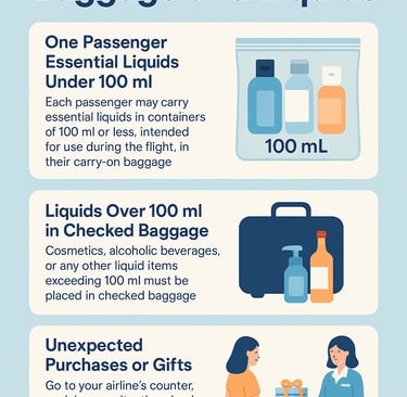 Most airlines permit passengers to carry up to 2 liters of liquids. If you accidentally bring liquids over 100 ml that are not allowed through security, the airline will usually register them as additional checked baggage. Even if your luggage is already at its weight or size limit, these excess liquid items are normally accepted and transported free of charge under this special rule.