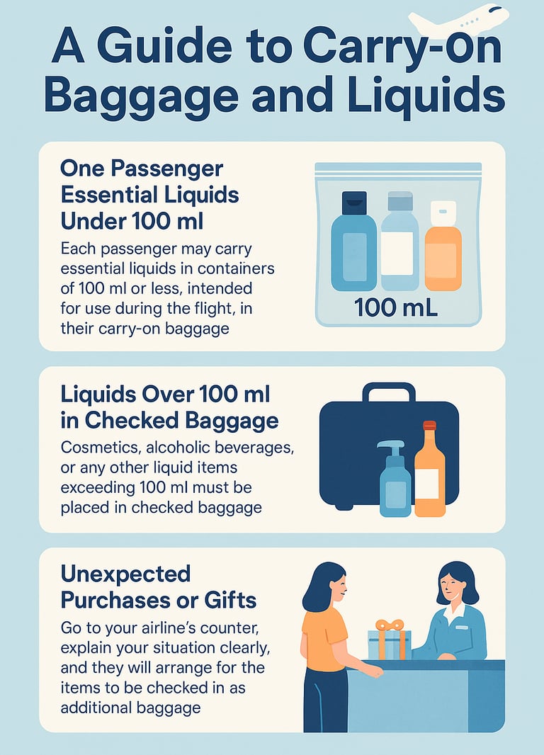 Many travelers buy souvenirs or receive farewell gifts after check-in while waiting for their flight. Without checking the contents, you might unknowingly bring liquids over the allowed limit, which may be flagged at security.